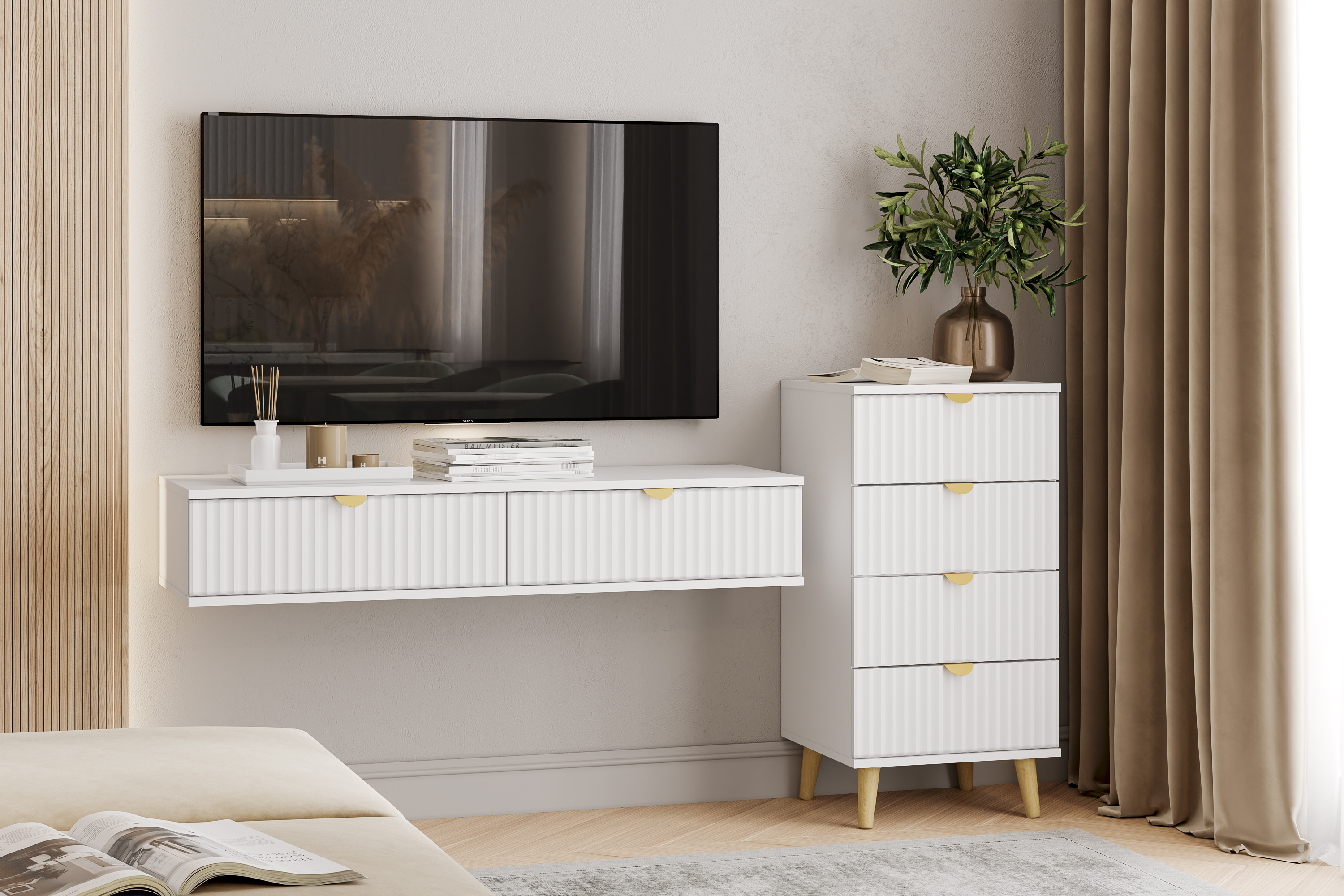 Модульная композиция включает тумбу и комод, оснащенные выдвижными ящиками, которые открываются плавно и бесшумно благодаря шариковым направляющим, при этом высокие опоры облегчают процесс уборки.