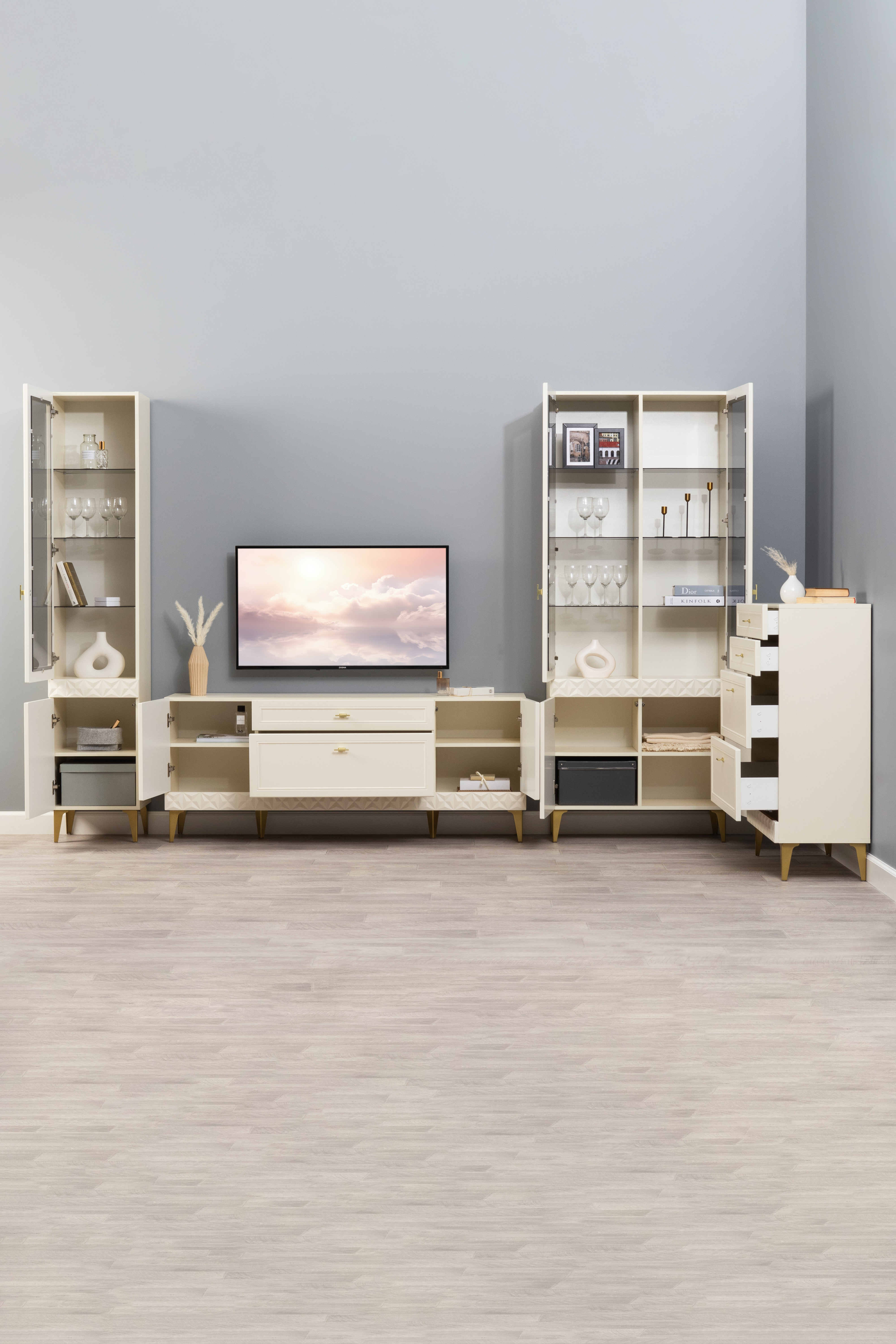 Гостиная Марион композиция 3 слоновая кость С341 PE, слоновая кость 6898 ПВХ, белый PE шагрень (собирается на любую сторону)