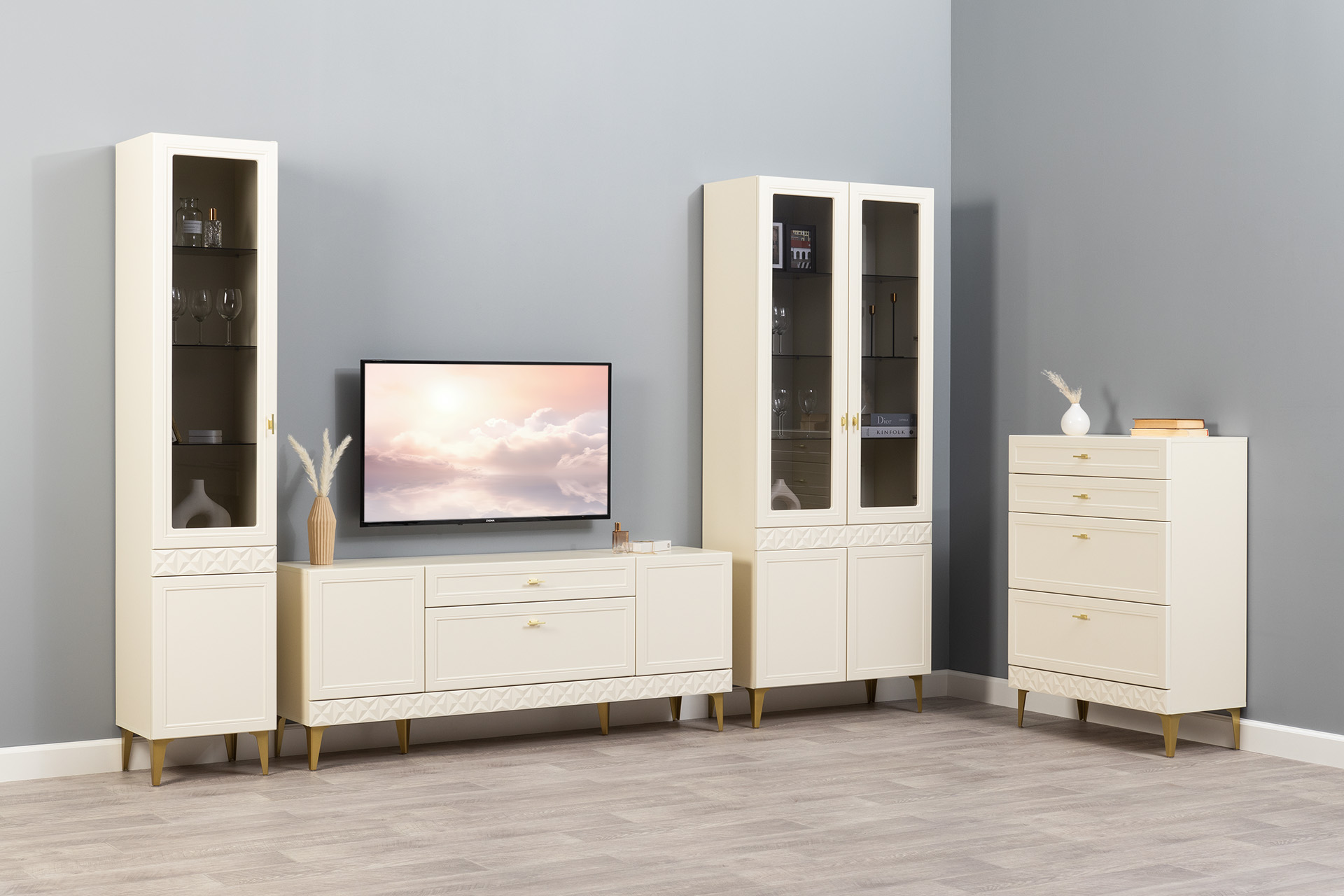 Изящные линии, глубокая фрезеровка фасадов из МДФ и благородные оттенки. Утончённая «Слоновая кость» и изысканная «Олива Шагрень» с глубоким зелёным тоном — создают атмосферу уюта, тепла и благородства. Металлические ручки и опоры золотого цвета придают мебели утончённый блеск, а петли и направляющие с доводчиками обеспечивают плавное и бесшумное закрытие фасадов.