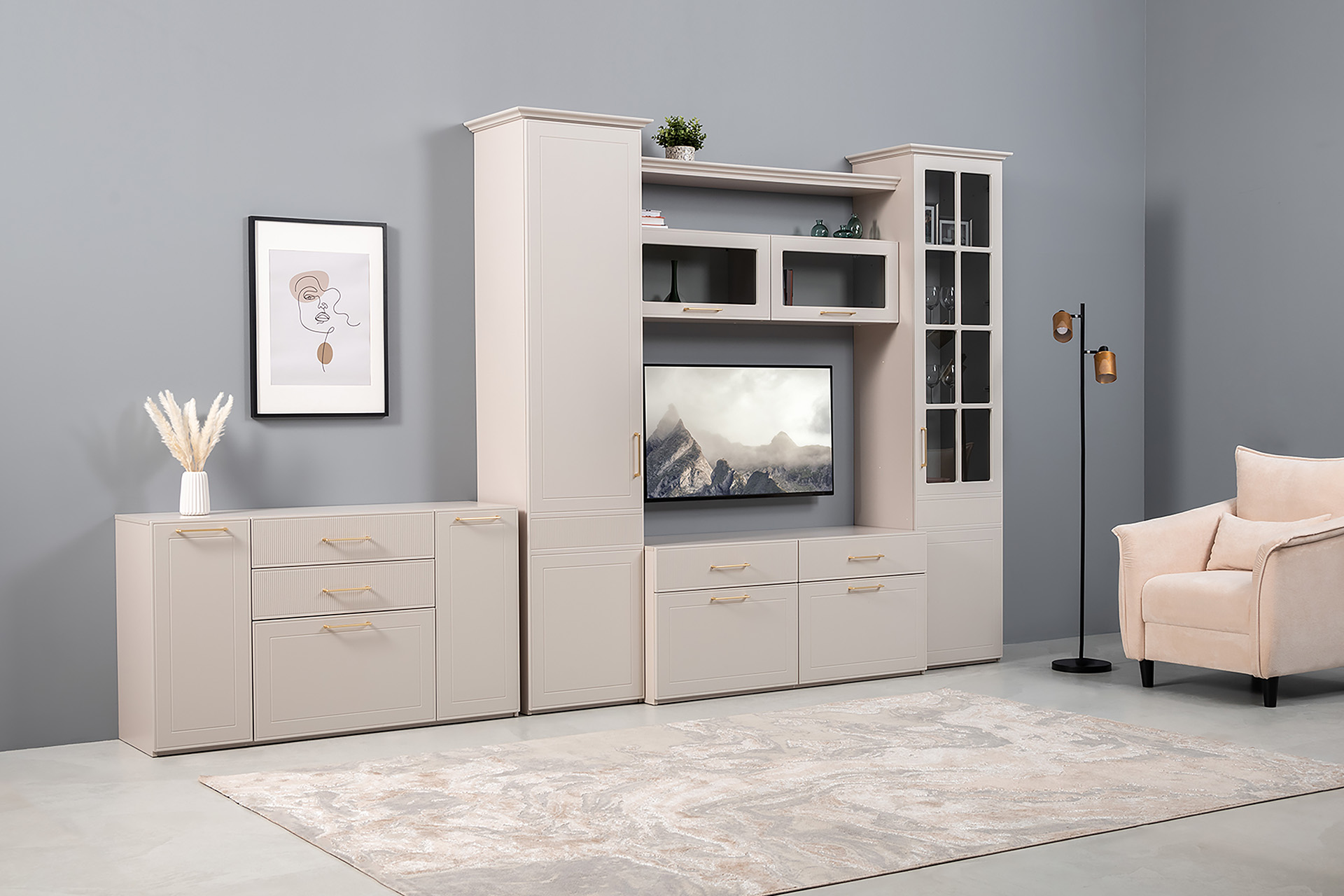 Гостиная Ричфорд композиция 1 с карнизами, кашемир 5981 BS, моно керамика D166-2 ПВХ, белый PE шагрень (собирается на любую сторону)