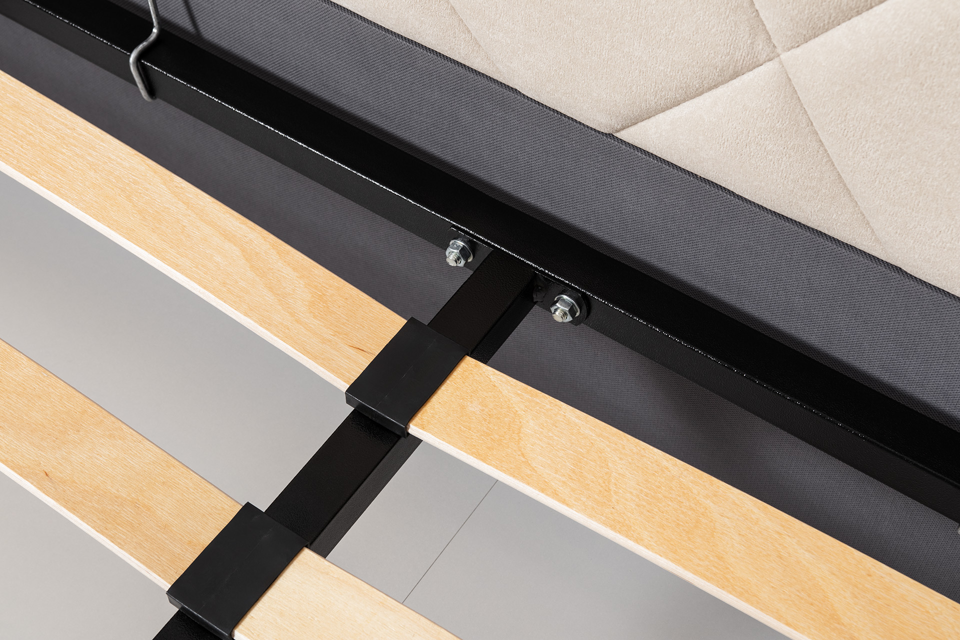Основание кровати укомплектовано матрасодержателями. Жесткое кроватное дно из ЛДСП 16 мм на опорах 25 мм.