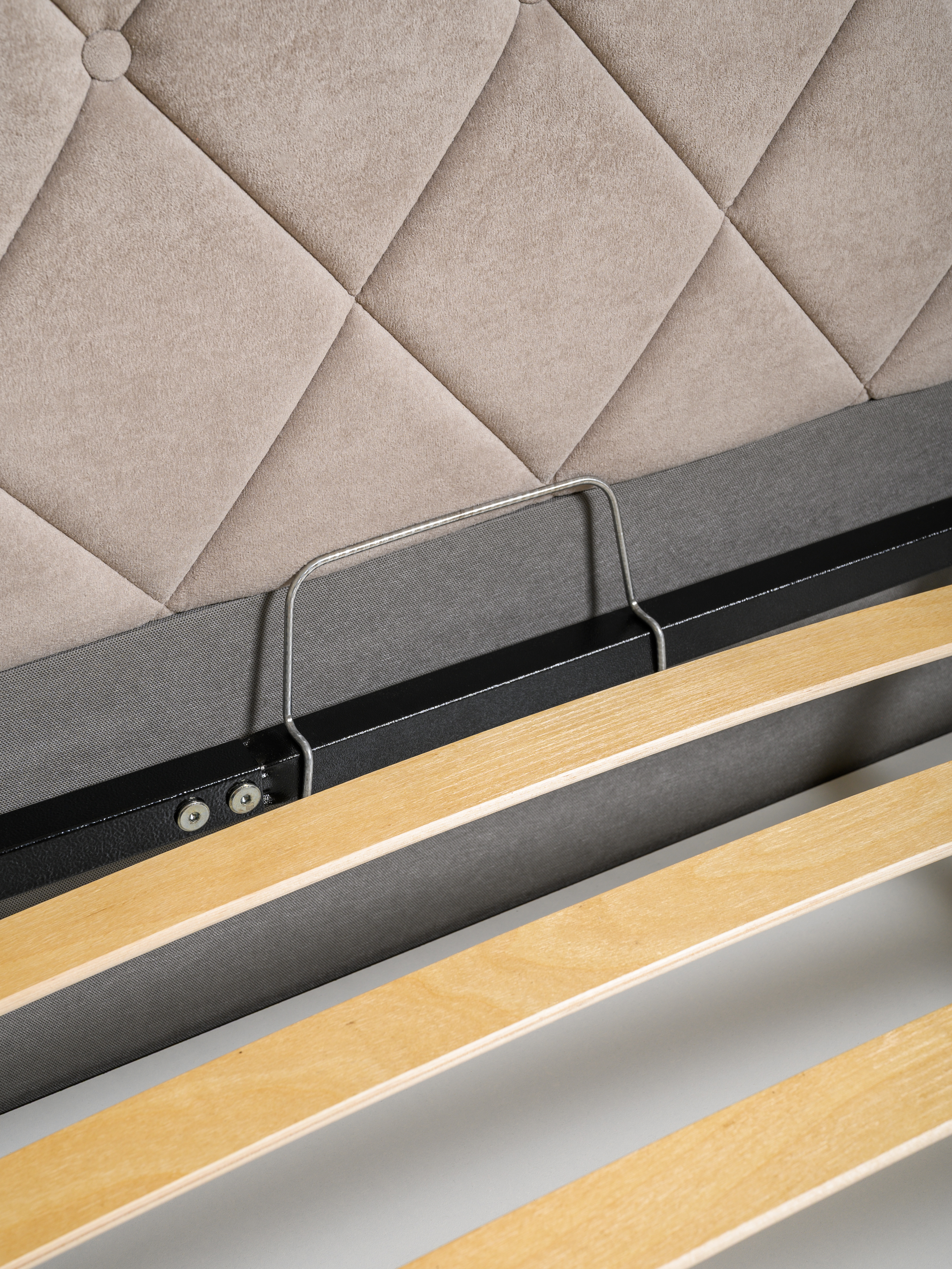 Кровать Марион — это идеальное сочетание стиля и комфорта. Элегантное изголовье оформлено стежкой в виде классической каретной стяжки, украшенной декоративными пуговицами, что придаёт изделию выразительный и утончённый вид. По всему периметру кровати проходит аккуратный валик, подчеркивающий геометрию и завершённость формы.