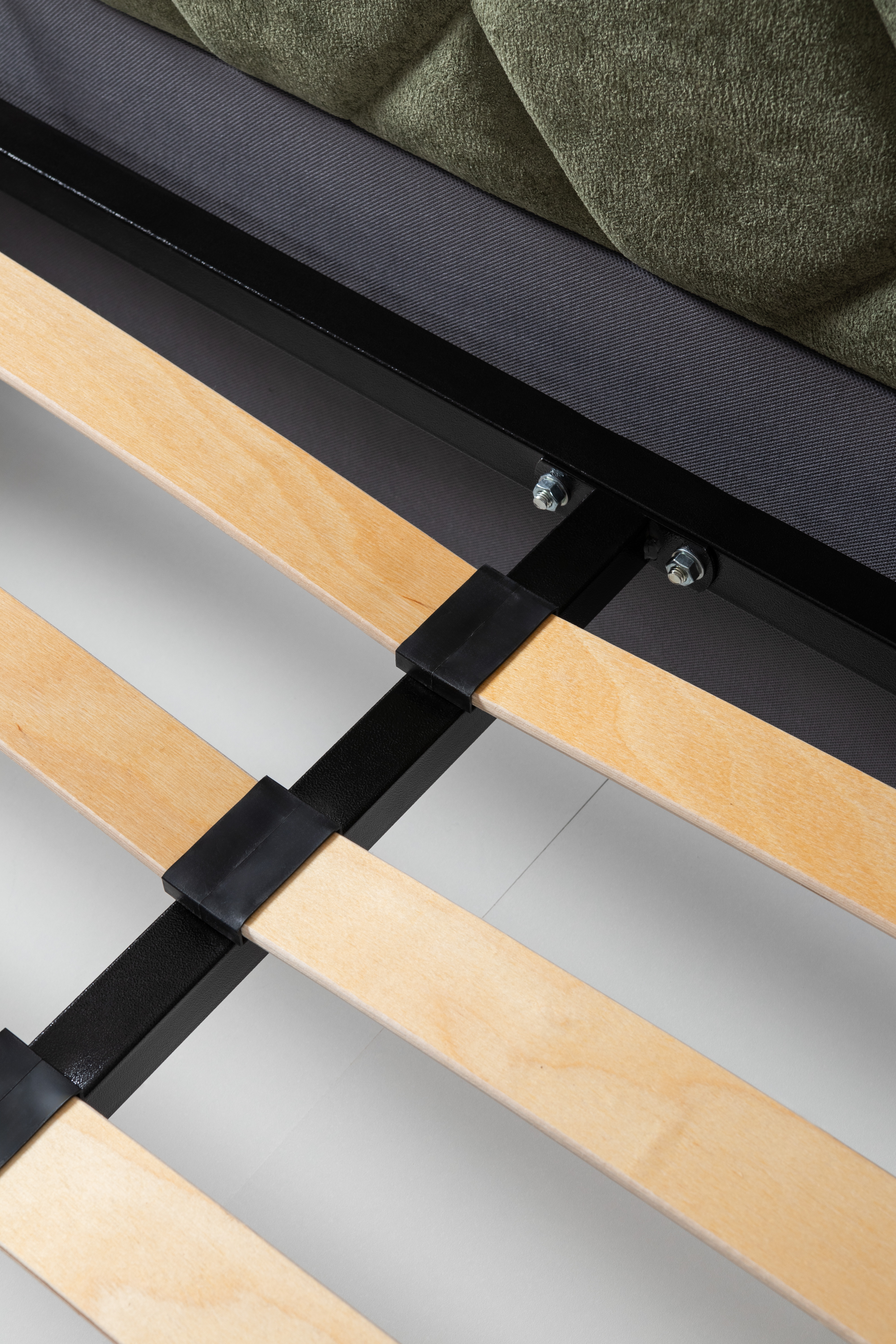 Основание кровати укомплектовано матрасодержателями. Жесткое кроватное дно из ЛДСП 16 мм на опорах 25 мм.