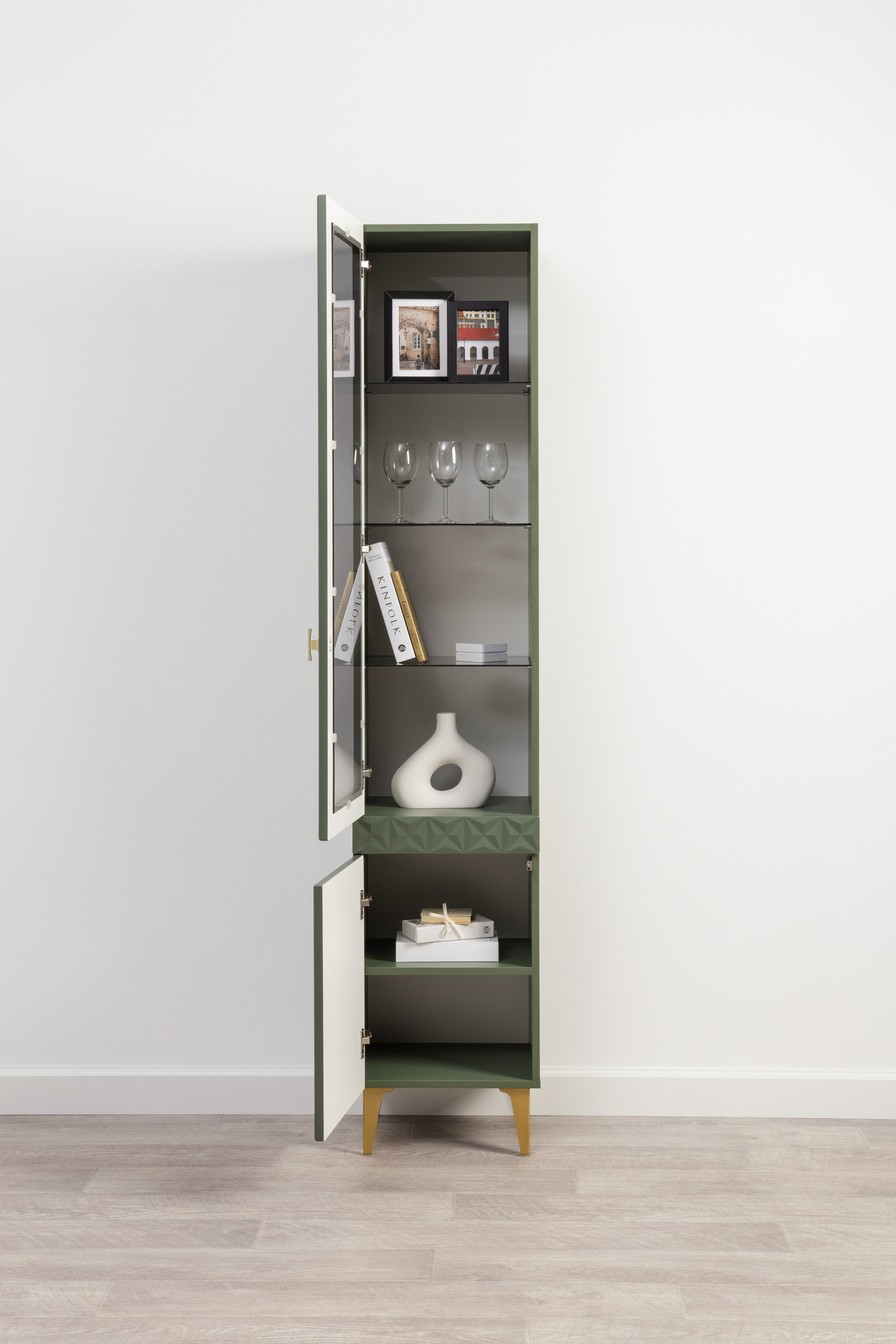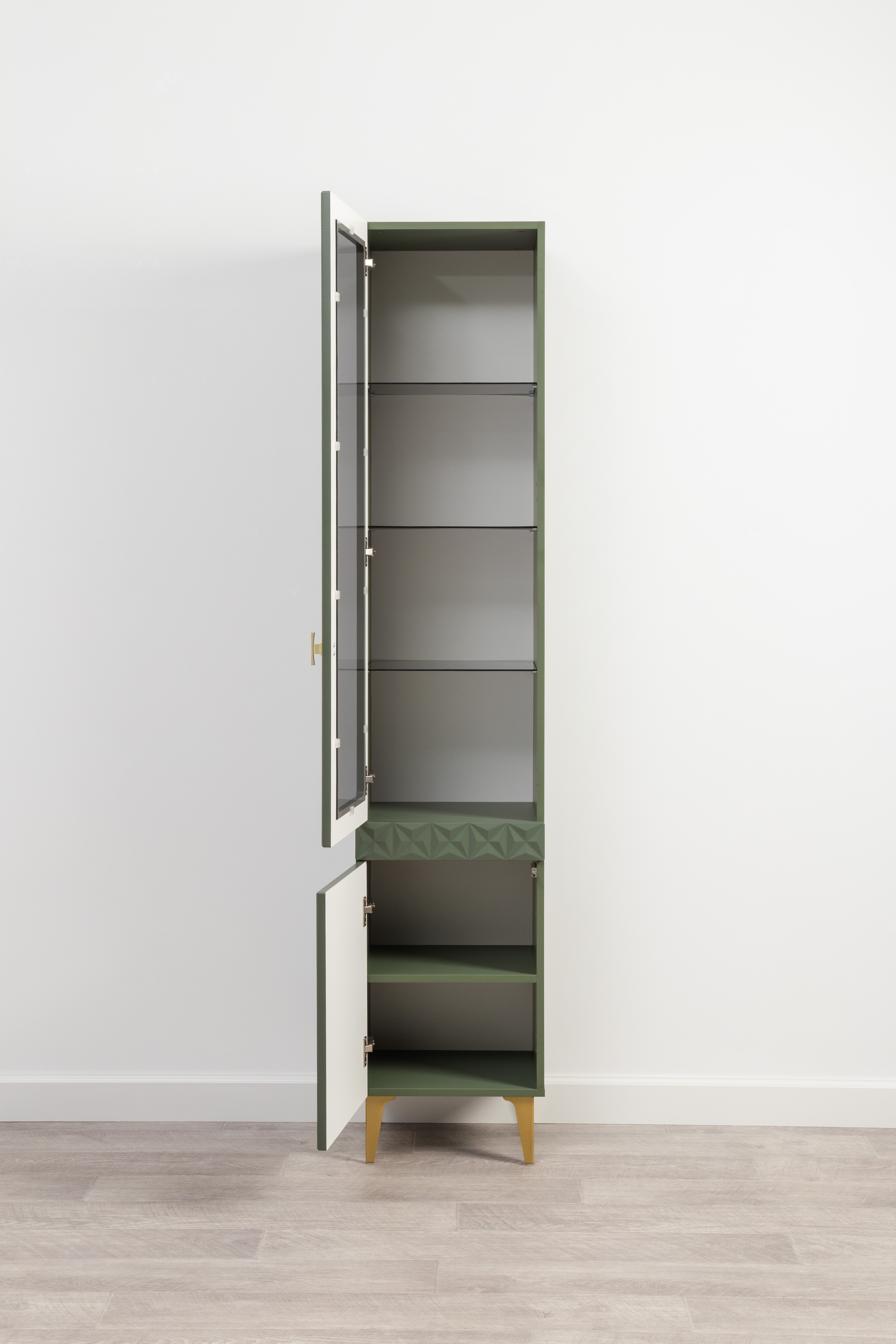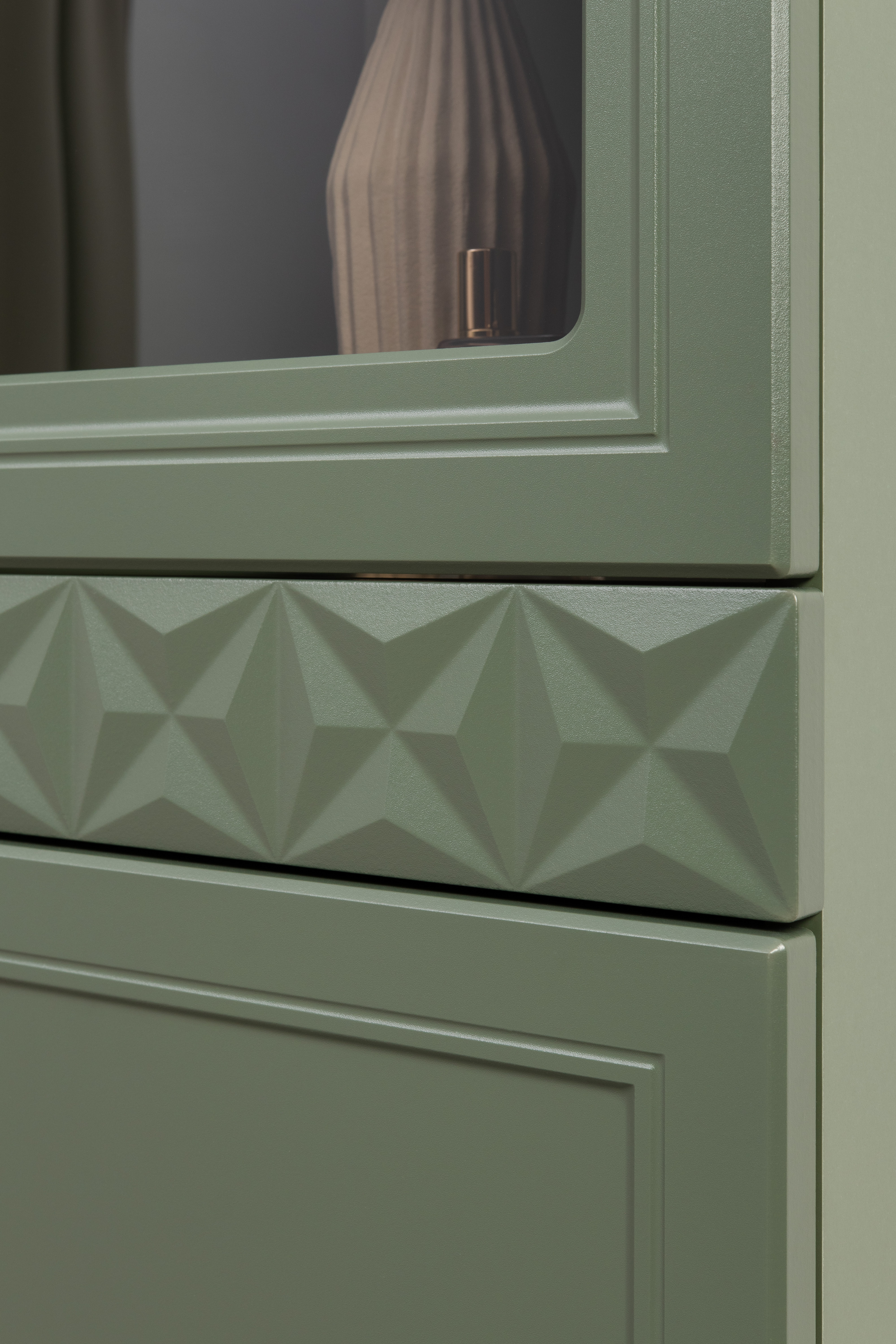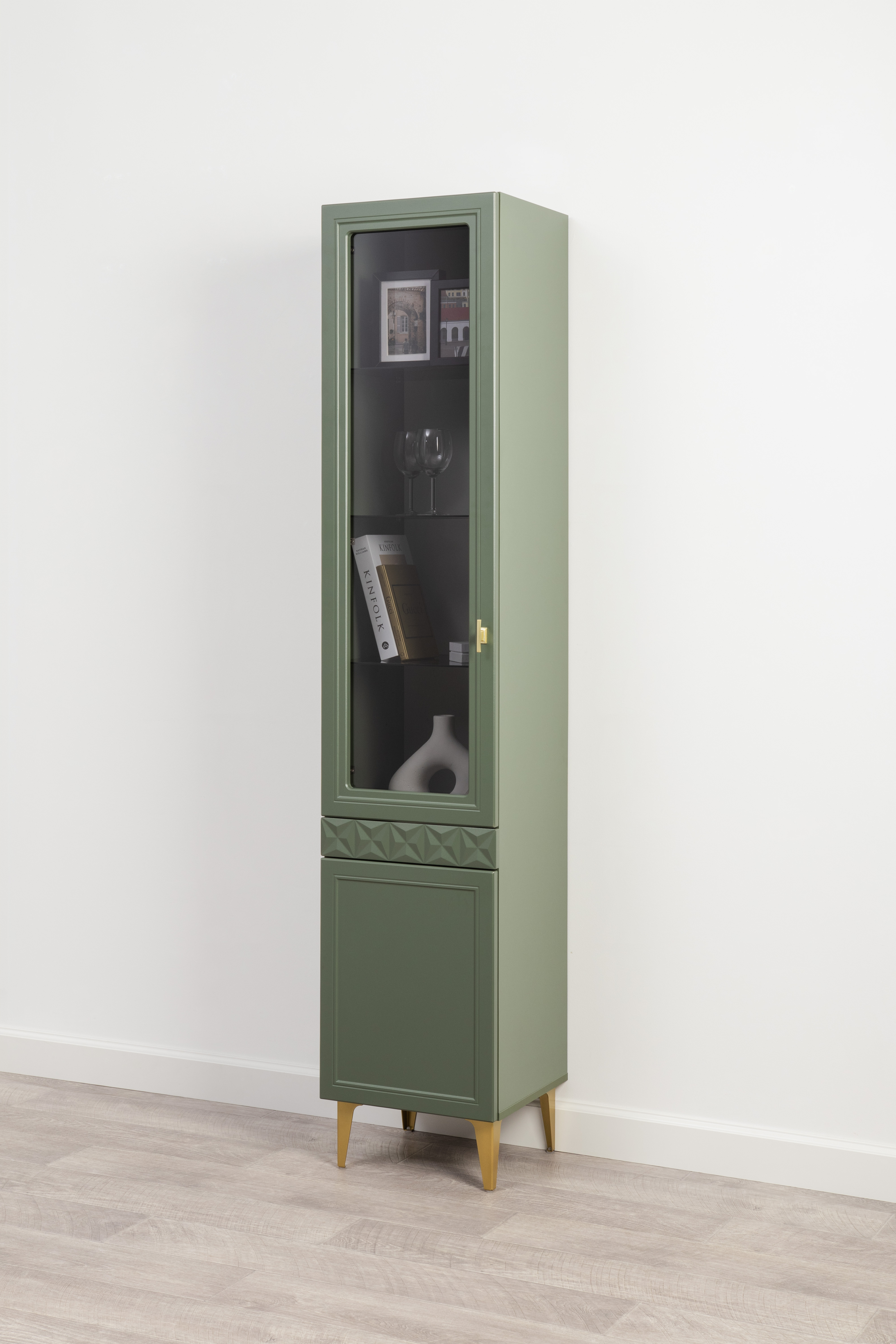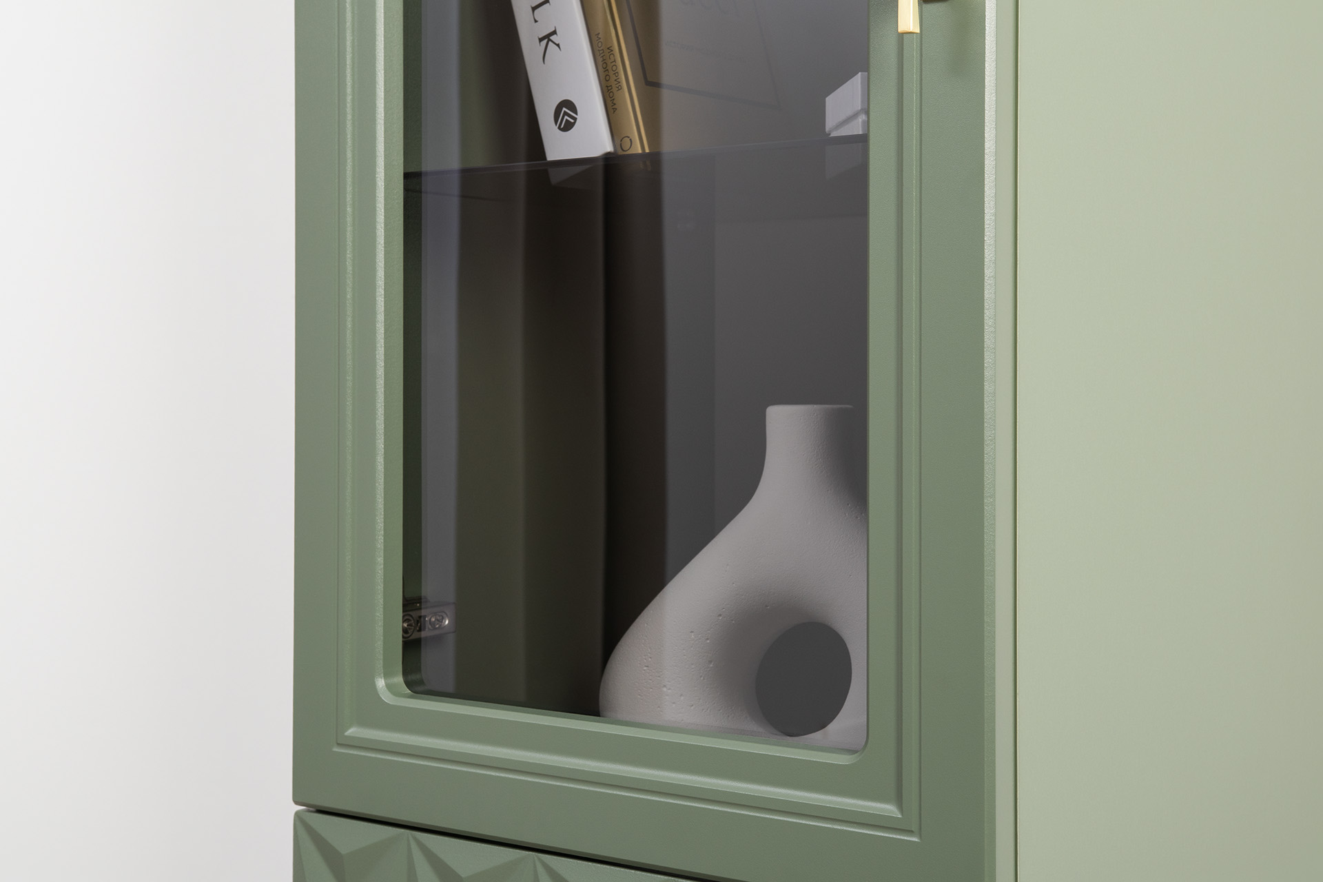 Шкаф-витрина Марион 16.397.01 дымчатый зеленый K521, олива шагрень AG 1050 ПВХ (собирается на любую сторону)